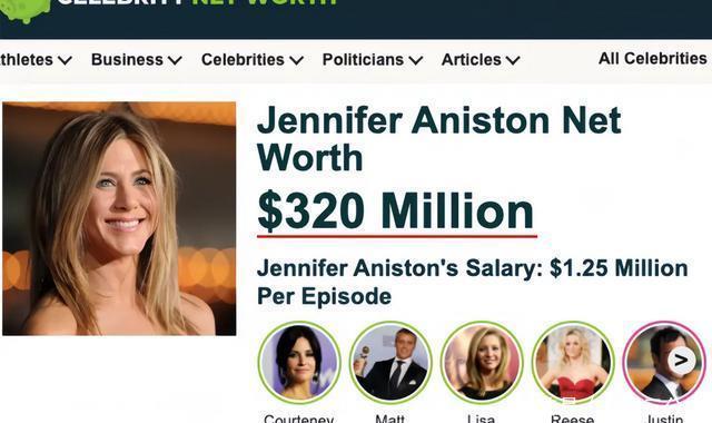 据《CelebrityNetWorth》报道,安妮斯顿的净资产高达3.2亿美元,是演艺圈妥妥的富婆。▼
